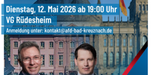 Einlass nur nach Anmeldung unter: kontakt@afd-bad-kreuznach.de Den genauen Veranstaltungsort teilen wir in der Bestätigungs- / Einladungsmail mit.